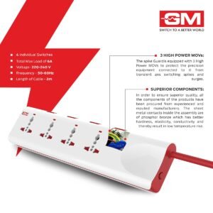 GM 3061 E-Book Power Strip,Extension Cord,Surge Protector,Spike Guard,Fire Retardant Protection,Thermal Trip,Overload Protection,Childsafety Shutter,4 International Sockets,Master Switch,LED,2M Cord